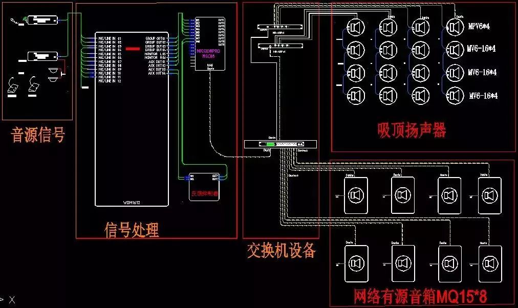 MQ-15為15寸有源音箱,通過Dante傳輸進(jìn)入主交換機;MVP6內(nèi)置功放Dante網(wǎng)絡(luò)傳輸?shù)奈斠粝洌恐晃斃韧ㄟ^音箱線并聯(lián)三只MV6-16,最終通過一根網(wǎng)線進(jìn)入系統(tǒng)MR-4RP交換機,同時給MVP6吸頂24V供電;MR-4RP通過網(wǎng)線連接主交換機。調(diào)音臺輸出模擬信號給音頻處理器,音頻處理器通過網(wǎng)線連接主交換機,無需輸出模擬信號,通過Dante網(wǎng)絡(luò)傳輸協(xié)議進(jìn)行數(shù)據(jù)處理。最終以Dante controller軟件進(jìn)行通道配備選擇。