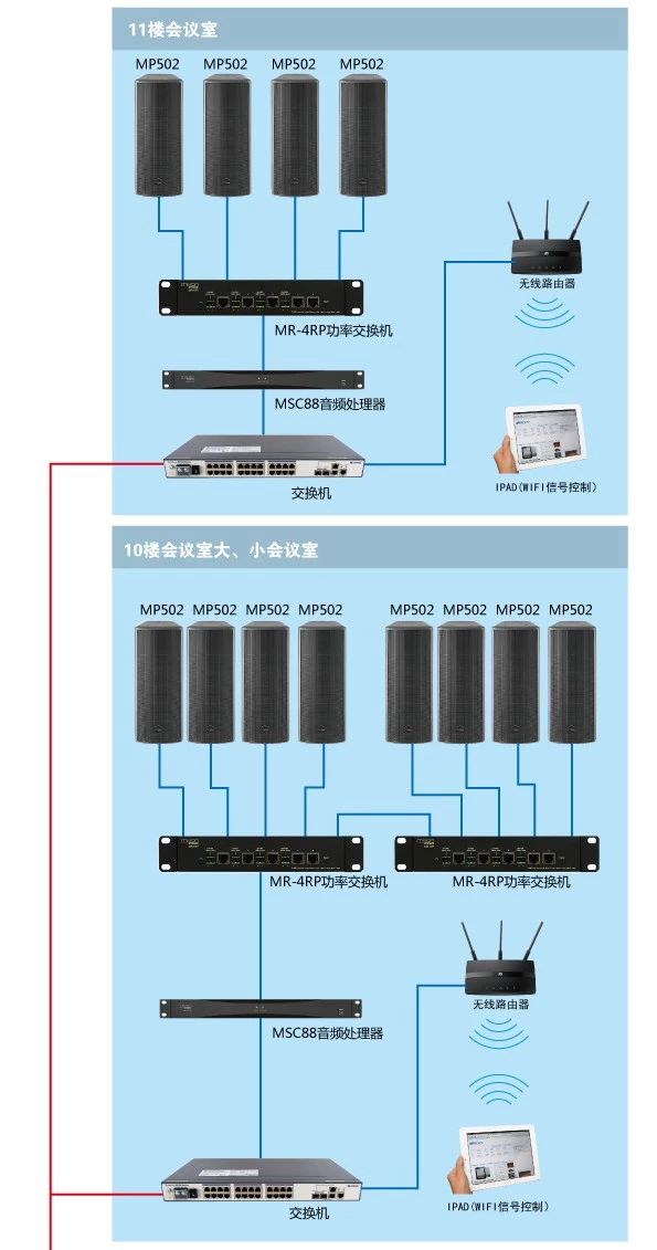在此次項目設(shè)計中,工程商選用了Mission Pro MP全頻系列中的MP-502作為會議室和多功能廳的主擴揚聲器。MP-502為雙5.5寸有源壁掛音箱,內(nèi)置Dante與D類功放模塊,通過一根網(wǎng)線進入系統(tǒng)MR-4RP功率交換機;MR-4RP通過網(wǎng)線連接MSC-88音頻處理器,最終通過網(wǎng)線連接主交換機,無需輸出模擬信號,通過Dante網(wǎng)絡(luò)傳輸協(xié)議進行數(shù)據(jù)處理。整座大廈采用了整合性極高的多功能分布式云控制系統(tǒng)。