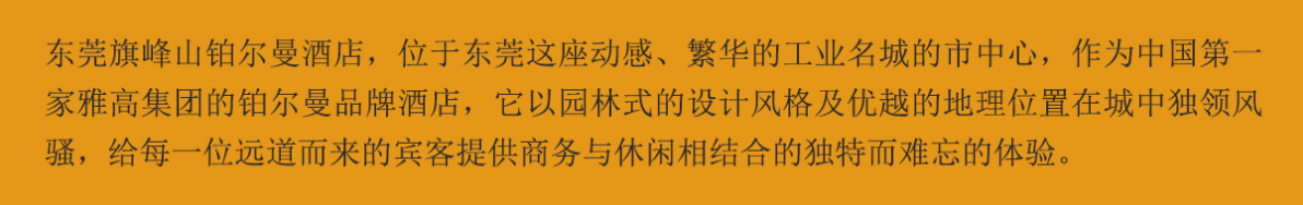 東莞旗峰山鉑爾曼酒店,位于東莞這座動感、繁華的工業名城的市中心,作為中國第一家雅高集團的鉑爾曼品牌酒店,它以園林式的設計風格及優越的地理位置在城中獨領風騷,給每一位遠道而來的賓客提供商務與休閑相結合的獨特而難忘的體驗。