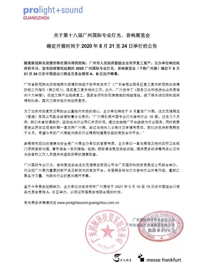 廣州國際專業燈光、音響 會由法蘭克福展覽有限公司與廣東國際科技貿易展覽公司聯合舉辦。行業視廣州展為重要的新產品及新技術的首發平臺。本屆展會將與燈光音響行業并肩作戰,重新匯聚各方力量,為娛樂行業的復興揭開序幕。
