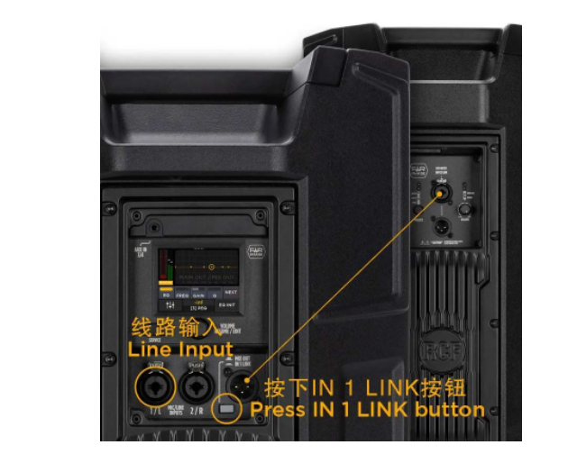 只需按下按鈕"IN 1 LINK",輸入1/L上的信號就會直接發送到輸出端。用于為其他揚聲器提供信號。