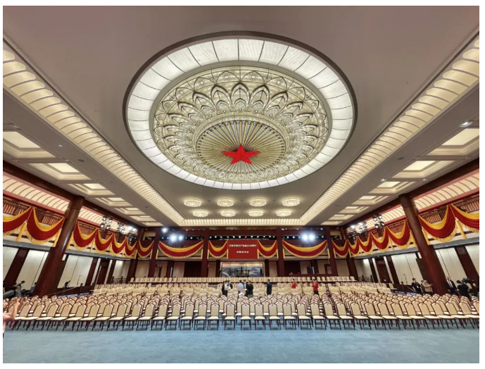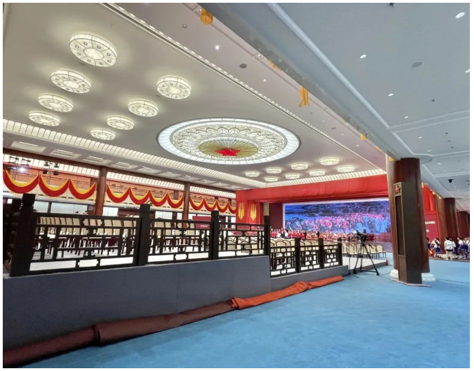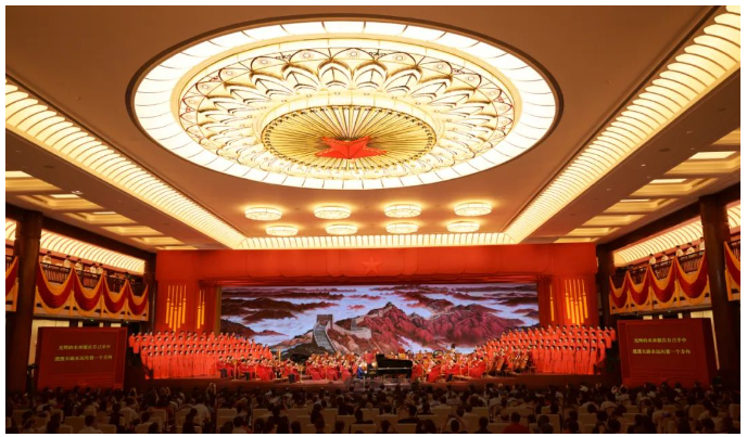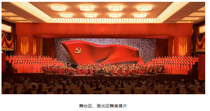 演出當(dāng)晚,紅色大廳燈火通明,用紅旗元素搭建、黃色綬帶裝飾的舞臺與帷幔一起烘托出慶典氛圍,大廳頂部中央鑲嵌的五角星熠熠生輝。