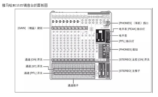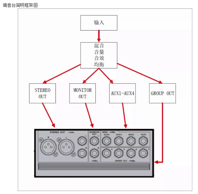 調(diào)音臺(tái)的主要功能是:把各種輸入的音頻信號(hào)在調(diào)音臺(tái)內(nèi)部進(jìn)行混音和細(xì)調(diào),然后在輸出接口輸出經(jīng)過(guò)調(diào)整的音頻信號(hào)。