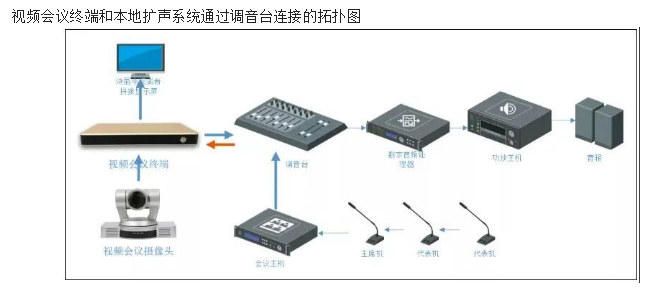 在連接視頻會(huì)議和本地話筒的時(shí)候,要把視頻會(huì)議終端的音頻輸出口連接到調(diào)音臺(tái)上去。然后本地話筒的信號(hào)經(jīng)過(guò)調(diào)音臺(tái)后,通過(guò)編組輸出到編組接口,然后再把調(diào)音臺(tái)的編組輸出,連接到視頻會(huì)議終端的音頻輸入接口。或者有時(shí)候?yàn)榱讼芈暎言捦驳木幗M輸出到數(shù)字音頻處理器,然后從音頻處理器再連接到視頻會(huì)議終端的音頻輸入接口。
