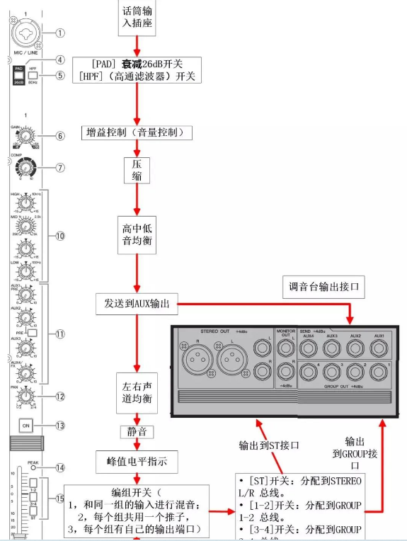 4.PEAK:峰值指示燈:Peak 燈亮?xí)r,警告使用者輸入信道內(nèi)的訊號(hào)過(guò)強(qiáng)。發(fā)現(xiàn) Peak 燈亮?xí)r,并且任由這種情況持續(xù)的話,調(diào)音臺(tái)會(huì)啟動(dòng)自我保護(hù)功能,切斷音源輸出。