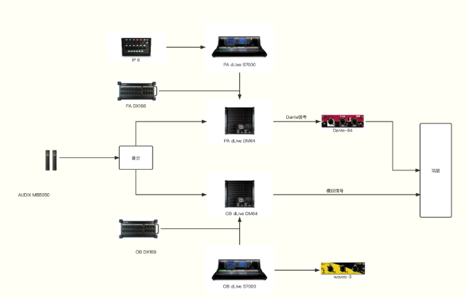 OB調(diào)音臺至擴聲系統(tǒng)通過傳統(tǒng)的模擬信號進行傳輸,并在OB房間的S7000臺面上加裝了一張Waves卡 用于OB混音。