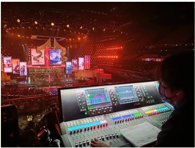 我公司設(shè)計團隊為西安曲江競技中心提供了固定安裝部分的擴聲系統(tǒng)解決方案。本屆電影節(jié)開、閉幕式現(xiàn)場使用了兩張Allen&Heath dLive S7000調(diào)音臺分別作為PA和OB調(diào)音臺,搭配兩個DM64引擎作為處理核心。