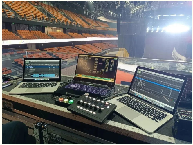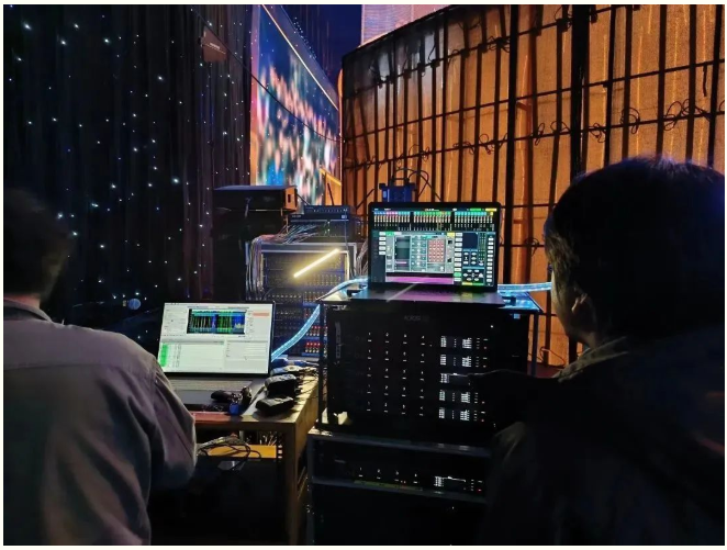 在前期進場搭建時,因遲遲無法確定PA控臺的最終位置,所以選擇了使用電腦端的Allen&Heath dLive director控制軟件與現(xiàn)場PA調(diào)音臺和OB調(diào)音臺的混音機架進行連接,從而快速方便地應(yīng)用于前期的系統(tǒng)調(diào)試工作,使音頻工程師免于在3樓控臺到1樓舞臺之間奔波。