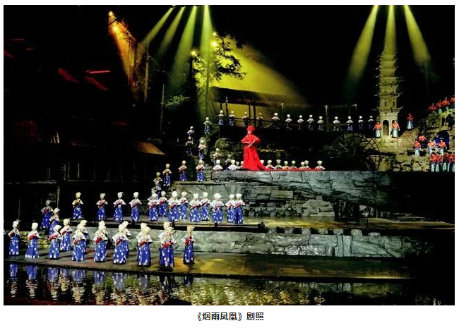 其實,這個方法之前也曾多次使用。不過這次的實踐讓筆者發(fā)現(xiàn),很多情況下聲音的獨(dú)特效果可以根據(jù)舞美場景,甚至利用舞美裝置的特性來實現(xiàn)。這一點以后也可以繼續(xù)跟音響師們研究探討,從中發(fā)現(xiàn)、挖掘并再現(xiàn)出契合戲劇創(chuàng)意的聲音效果。例如,國外有的錄音棚用老教堂或者工廠廠房改造,以得到想要的聲音效果,包括好萊塢的電影錄音。這具有無限拓展的可能性,因為每一種聲音在不同的空間都會是不同的,關(guān)鍵也在于音響師是否有主觀創(chuàng)新的想法,畢竟對于多數(shù)戲劇音響設(shè)計來說,音響師首先要保證的是戲劇對聲音的基本要求,然后才是個性化需求。另外,音響師對舞美空間的解讀也尤為重要,舉個例子,幾年前參加湖南鳳凰的《煙雨鳳凰》實景演出項目的舞美設(shè)計,景的縱深有50 m多,一側(cè)是用于造景的山,一側(cè)是吊腳樓,中間風(fēng)雨橋作為兩者的連接,遠(yuǎn)處縱深就是利用實景的山和樹林。該劇的音響師就根據(jù)這樣一個悠遠(yuǎn)的空間環(huán)境,制造從左到右的聲像差,形成由遠(yuǎn)及近的聲音效果,的確讓觀眾感受到了空間距離上聲音傳遞效果,十分契合舞美所營造出的氛圍。