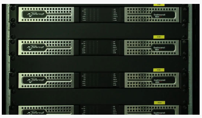 功率放大器全部采用Powersoft Quattrocanali 4804 DSP+DANTE數字功率放大器。擴聲控制室與功放機房之間采用光纖網絡音頻的方式進行遠距離傳輸,縮減模擬線路傳輸距離,降低線路損耗,有效提升系統內音頻信號的傳輸質量。