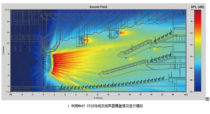當(dāng)獲得足夠的場(chǎng)地信息之后,需要利用揚(yáng)聲器廠家提供的模擬軟件(或者通過(guò)Ease Focus這種基于GLL文件的通用設(shè)計(jì)軟件)進(jìn)行建模,這些軟件可在可視化的條件下,實(shí)時(shí)調(diào)整并計(jì)算不同設(shè)計(jì)方案的覆蓋均勻度以及聲壓級(jí)分布,較為復(fù)雜的模擬軟件(如Ease)甚至可以將反射和墻面材質(zhì)的吸聲特性都考慮在內(nèi),實(shí)現(xiàn)對(duì)反射情況的模擬(見(jiàn)圖1)。系統(tǒng)建模和預(yù)測(cè)的重要作用在于讓系統(tǒng)工程師在裝臺(tái)開(kāi)始之前就能夠做好全部的計(jì)劃和準(zhǔn)備工作,進(jìn)而起到減少正式施工時(shí)長(zhǎng)并提高工作效率的作用。