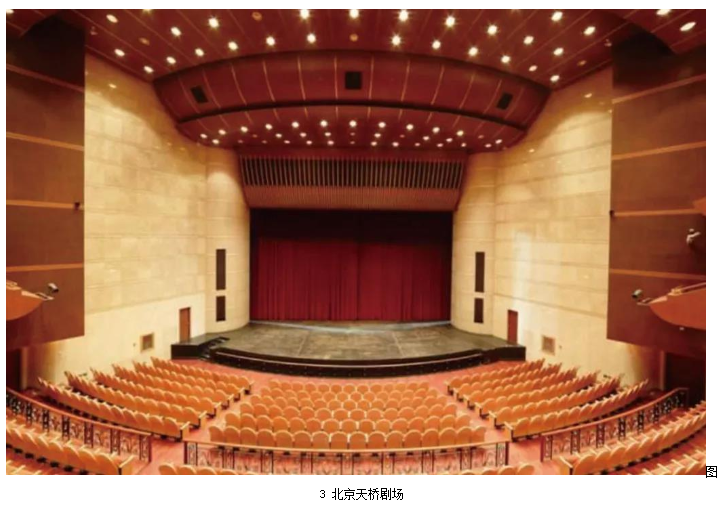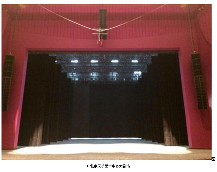 標(biāo)準(zhǔn)劇場(chǎng)中,中置揚(yáng)聲器組的安裝通常分為暗裝和明裝兩種。暗裝一般是安裝在舞臺(tái)鏡框上沿預(yù)留的聲橋當(dāng)中,如北京天橋劇場(chǎng)(圖3)。明裝則是吊掛在舞臺(tái)燈桿或預(yù)留的吊點(diǎn)上,如北京天橋藝術(shù)中心大劇場(chǎng)(圖4)。暗裝對(duì)觀眾的視覺(jué)影響最小,如果劇場(chǎng)擴(kuò)聲系統(tǒng)設(shè)計(jì)合理,建筑聲學(xué)指標(biāo)達(dá)標(biāo),且在鏡框高度不是很高的情況下,劇場(chǎng)中置聲道暗裝是最好的安裝方式。但是國(guó)內(nèi)劇場(chǎng)的實(shí)際情況并不樂(lè)觀,且不同演出的系統(tǒng)工程師和音響設(shè)計(jì)師都有各自的設(shè)計(jì)和考量,暗裝中置聲道位置又基本不可調(diào)整,所以很多劇場(chǎng)中暗裝的中置聲道使用率很低。明裝的中置聲道更便于安裝、拆卸以及調(diào)整,更加適合流動(dòng)性強(qiáng)的演出,因此,越來(lái)越多的現(xiàn)代化劇場(chǎng)采用這種安裝方式。