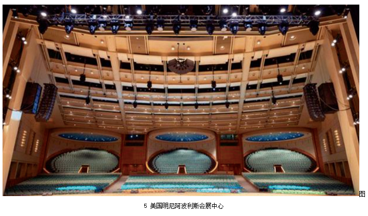 此外,還有一些劇場(chǎng)由于應(yīng)用場(chǎng)景的不同,揚(yáng)聲器系統(tǒng)既要減少舞臺(tái)垂直方向上對(duì)觀眾的視覺(jué)影響,還要滿足較寬觀眾席對(duì)水平覆蓋的需求。例如美國(guó)明尼阿波利斯會(huì)展中心使用ARCS恒定曲率線陣列揚(yáng)聲器,這種揚(yáng)聲器陣列在垂直方向上的輻射角度不可調(diào)整,但水平角度上中置揚(yáng)聲器幾乎可以覆蓋到整個(gè)觀眾席,甚至可以比左右聲道揚(yáng)聲器承擔(dān)更大的功率,這對(duì)于以語(yǔ)言類為主的會(huì)議等應(yīng)用場(chǎng)景來(lái)說(shuō)是十分方便且有效的。
