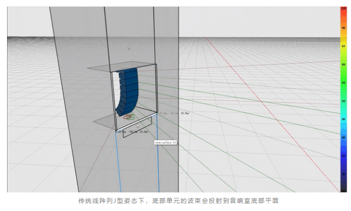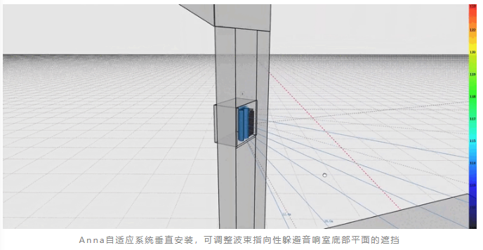 在暗裝的方式下音響室空間通常狹小緊湊。在本項目中,音響室的底部平面距離陣列僅10厘米。如果采用傳統(tǒng)線陣列的擴聲系統(tǒng),陣列會形成J字型物理姿態(tài),不僅占用較大的安裝空間,J型底部的音箱單元還有可能將聲能投射到音響室的底部平面上,導致大部分高頻能量無法穿透出來,從而無法覆蓋到一部分前區(qū)的觀眾區(qū)。選用Anna,它的垂直吊裝方式既能節(jié)約了安裝空間,還能將高中低頻單元統(tǒng)一的盡可能靠近透聲幕,躲避音響室底部平面對波束的遮擋,最終實現(xiàn)幾乎全場的覆蓋。