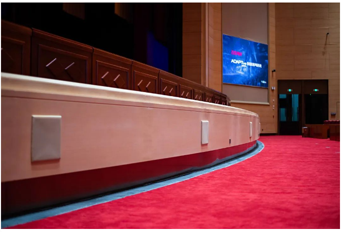 舞臺臺唇固定安裝了多只CMI5,為觀眾席前排座席補充中高頻響應(yīng)。CMI5是采用同軸設(shè)計的超緊湊兩分頻揚聲器,可以提供優(yōu)秀的指向性控制和均勻一致的聽音體驗。針對安裝位置過高,而造成的兩側(cè)主擴揚聲器覆蓋不足的情況,在左右八字墻大屏下方位置,固定暗藏了MKD896點聲源揚聲器予以補充。